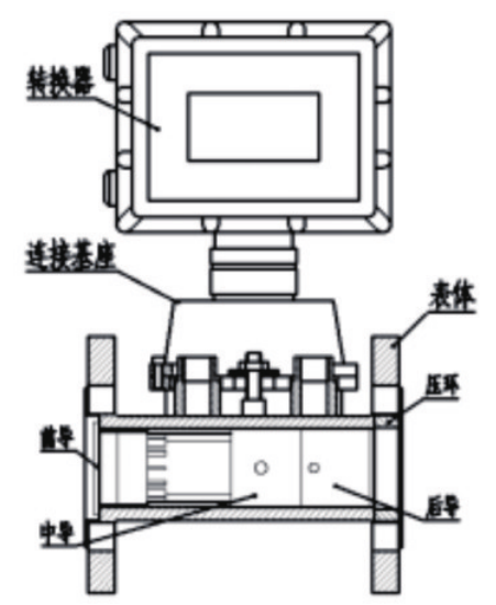 溫壓補(bǔ)償型氣體渦輪流量計(jì)的基本結(jié)構(gòu)如圖所示,它主要由表體、機(jī)芯(前導(dǎo)向、中導(dǎo)向、后導(dǎo)向)、連接基座和轉(zhuǎn)換器等組成。