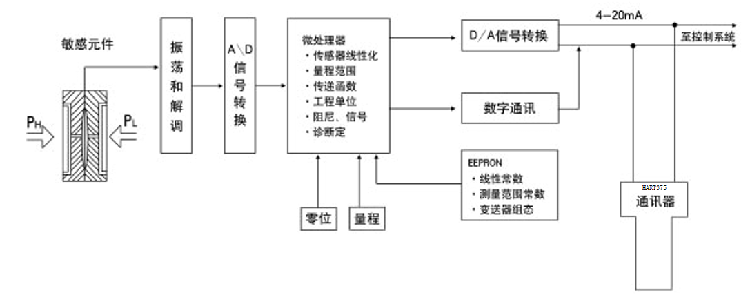 壓力變送器的測量原理告訴我們其測量壓力的過程主要包括被測量介質壓力的傳遞感知、微處理器的信號轉換及信號輸出這三個過程,下面簡單介紹一下。