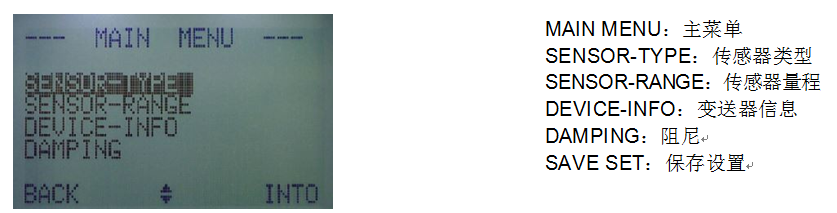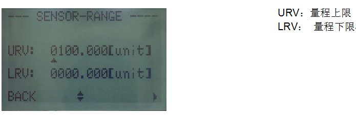 第 4 步, 按按鈕返回主菜單,按按鈕進入 SENSOR-RANGE(傳感器量程)子菜單,設定傳感器量程。