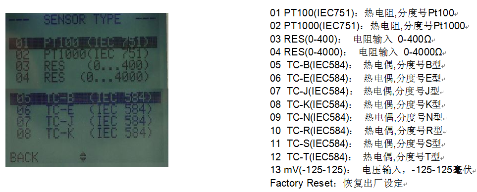 第 2 步, 按按鈕進入 SENSOR-TYPE(傳感器類型)子菜單,按按鈕可以選擇不同的傳感器類型,被選中的傳感器類型以亮黑形式