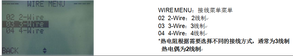 第 3 步, 按按鈕進入WIRE MENU(接線菜單)子菜單,按按鈕可以選擇不同的接線方式,被選中的接線方式以亮黑形式
