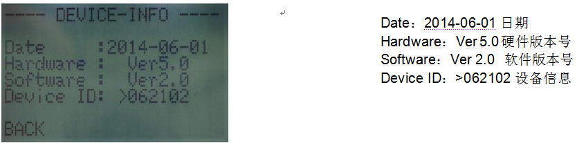 第 5 步, 按按鈕返回主菜單,跳至第 7 步或按按鈕可以進入 DEVICE-INFO(變送器信息)子菜單,可以查看變送器的設備信息(一般情況下,用戶不需要進入此菜單)。