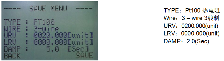 第 7 步, 按按鈕返回主菜單,按按鈕可以進入 SAVE SET(保存設定)子菜單, 按按鈕保存所有組態配置, 連續按按鈕返回顯示界面,這樣量程范圍就更改好了。