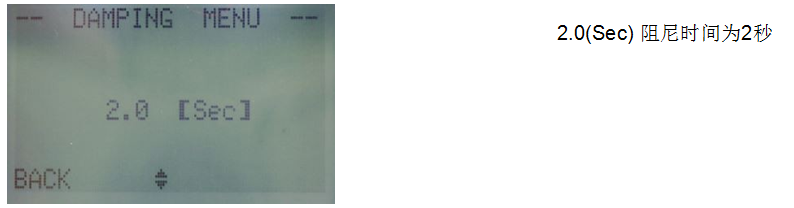 第 6 步, 按按鈕返回主菜單,跳至第 7 步或按按鈕可以進入 DAMPING(阻尼)子菜單, 按按鈕增加或減少變送器的阻尼時間(一般情況下,默認阻尼時間為 2 秒,用戶不需要對阻尼時間再設定)。