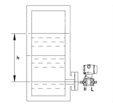 如圖所示,高壓室法蘭與容器低端法蘭相接,而低壓室法蘭安裝在與高壓室法蘭同一水平線上的大氣中。那么變送器量程為L=H·ρ